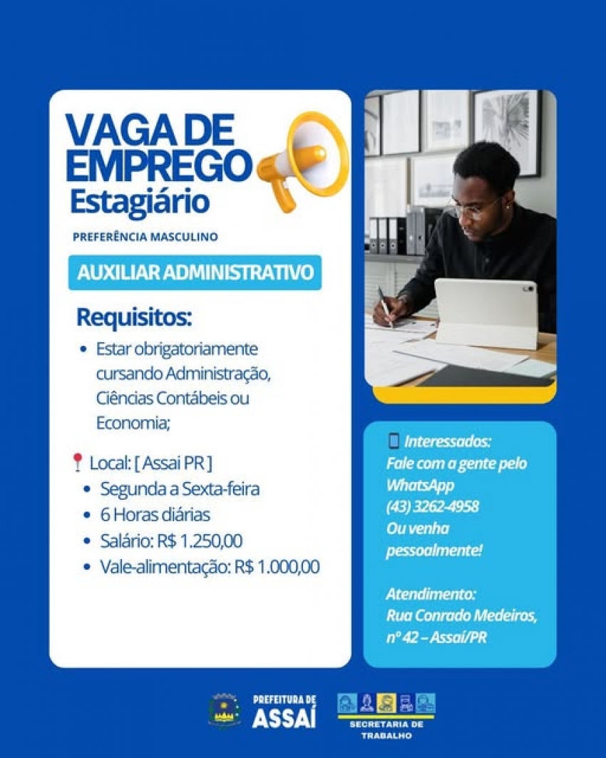 A Agência do Trabalhador de Assaí tem vaga de trabalho para trabalho para Estágio em Auxiliar Administrativo